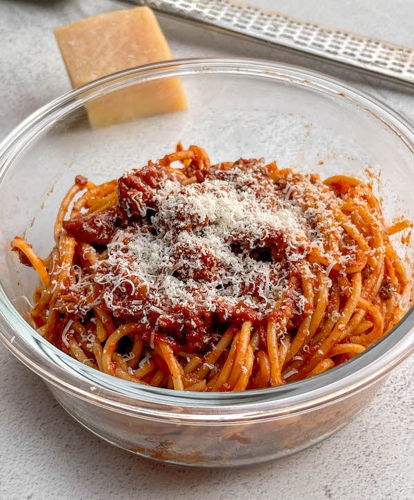 Spaghetti Bolognese - A thick and rich Bolognese sauce mixed with ground beef served over spaghetti, with parmesan cheese on the side and an option of a bun.
